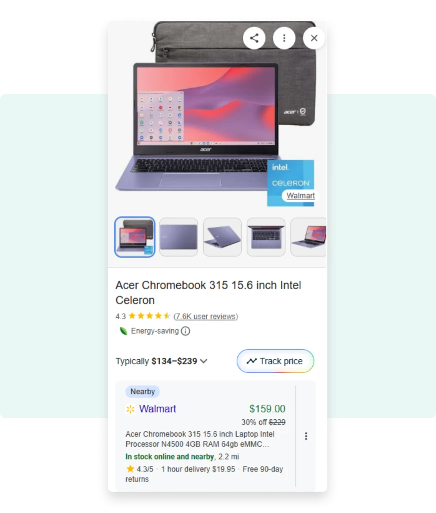- Cards that show product image, price, rating, and merchant name, pulled from your feed and your site