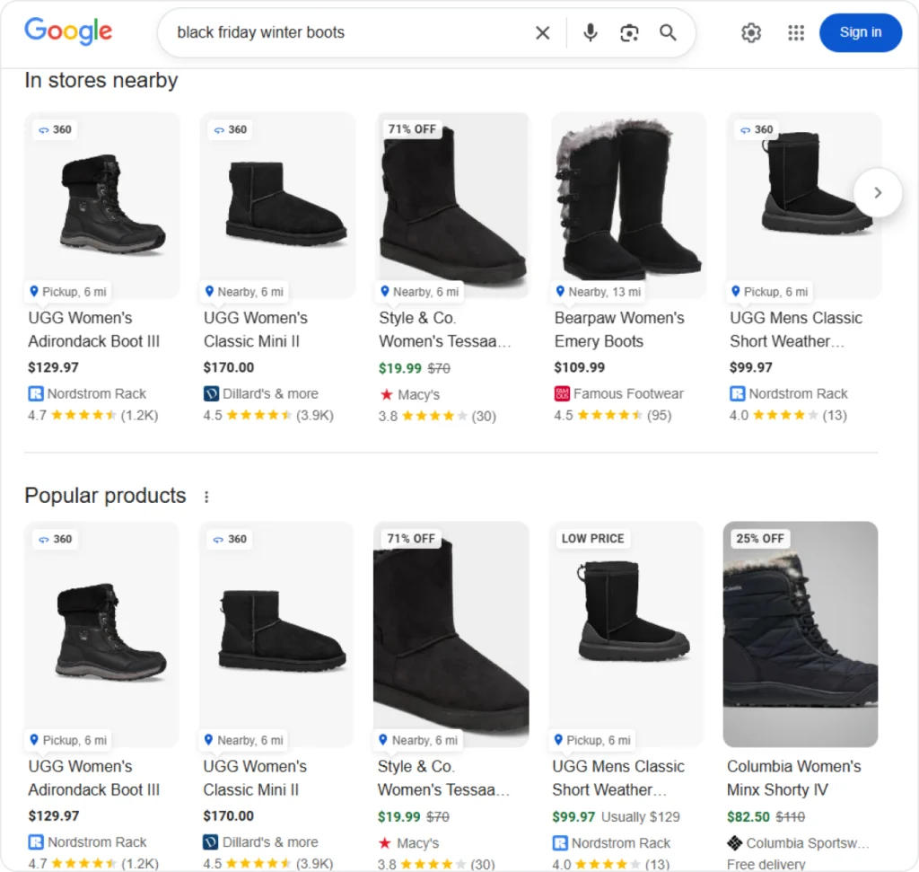 When shoppers search for “black Friday TV deals” or “mens winter boots sale,” a page of ten blue links is NOT what shows up.