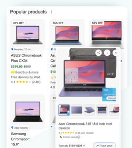 Visual blocks labeled things like “Popular products,” “More products,” or “Best products” that appear in standard search results